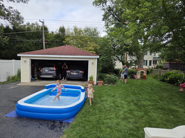家の庭に大きなプールをセットしたそうで、食事の後、外に出てジョアナの妹のエレノアとジョアナが一緒にプールに入るのを私たちは見守りながら、一緒に遊びました。